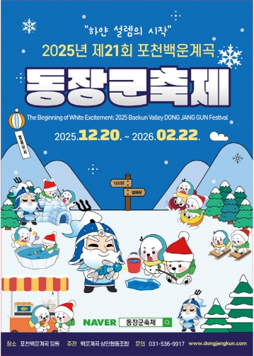 제21회 포천백운계곡 동장군축제는 2025년 12월 20일부터 2026년 2월 22일까지 총 65일간 경기 포천시 이동면 백운계곡 일원에서 열린다. 축제장은 매일 오전 9시부터 오후 5시까지 운영되며, 겨울철 낮 시간대에 안전하고 쾌적하게 즐길 수 있도록 구성됐다.