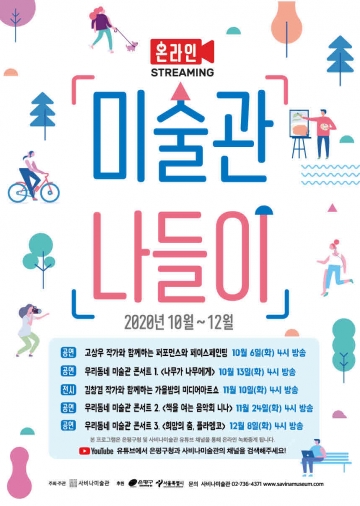 「온라인 미술관 나들이」 프로그램은 2020년 9월 11일(금)부터 11월 13일(금)까지 격주 금요일 총 5회에 걸쳐 녹화되며, 10월 6일부터 유튜브를 통해 세계적인 미디어아티스트가 선보이는 미디어아트 쇼, 유명작가가 진행하는 퍼포먼스 공연 및 페이스페인팅 촬영 등 고품격 융복합문화예술행사를 감상할 수 있다.