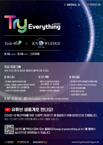 ‘Try Everything 2020’에 대한 자세한 내용과 일정 확인은 공식 홈페이지(http://tryeverything.or.kr)에서 확인 가능하며, 행사 당일 홈페이지에 개설되는 유튜브 채널을 통해 세션별로 실시간으로 시청과 댓글달기에 참여할 수 있다.