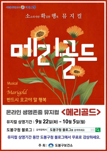 도봉구(구청장 이동진)는 오는 9월 22일부터 10월 5일까지 14일 간 코로나19로 지친 구민들의 코로나블루 해소를 위해 생명존중 뮤지컬 ‘메리골드’를 온라인 상영한다.