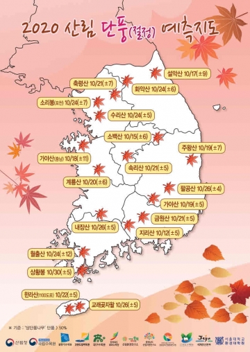 - 주왕산(경북) 10/19(±7일), 계룡산(충남) 10/20(±6일), 속리산(충북) 10/21(±5일), 한라산 1100도로(제주) 10/22(±5일), 수리산(경기) 10/24(±5일), 내장산(전북) 10/26 (±5일)로 각각 예측됨