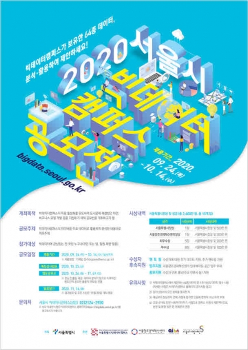 서울특별시는 빅데이터캠퍼스의 이용 활성화를 유도하여 도시문제 해결방안 마련, 비즈니스 모델 개발, 빅데이터 기반의 4차 산업발전 등을 통한 사회혁신기반을 조성하기 위해 ‘2020 서울시 빅데이터캠퍼스 공모전’을 개최한다.