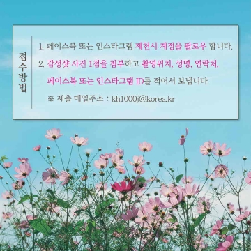 접수기간은 9. 28.(월) ~ 10. 16.(금) 3주간이며 접수방법은 페이스북 또는 인스타그램 제천시청 계정 팔로우 후 감성 샷 사진 1점을 첨부하고 촬영위치, 성명, 연락처, 페이스북 또는 인스타그램 ID를 적어서 kh1000j@korea.kr 로 보내면 된다.