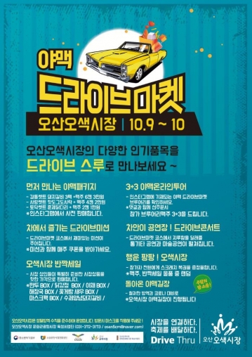 오산시(시장 곽상욱)는 오는 10월 9일부터 10일까지 이틀간 오산 오색시장에서 드라이브스루 방식으로 ‘오산 오색시장 야맥 드라이브 마켓’을 진행한다.