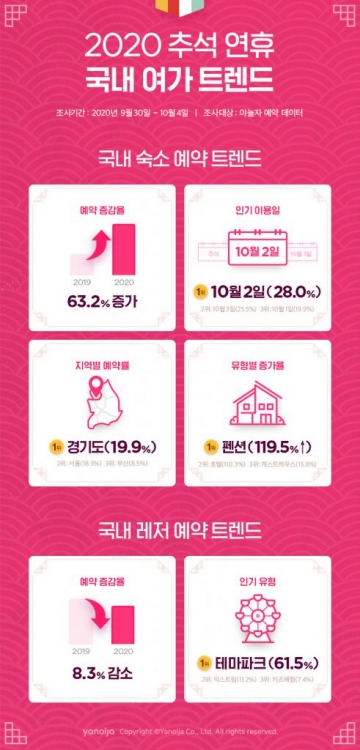 글로벌 여가 플랫폼 기업 야놀자(총괄대표 이수진)가 2020년 추석 연휴 기간 국내 여가 트렌드를 발표했다.