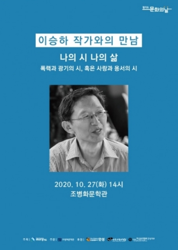 조병화문학관(관장 조진형)은 경기도 문화의 날 행사의 일환으로 10월 27일 화요일 오후 2시에 시인 이승하의 ‘나의 시, 나의 삶 : 폭력과 광기의 시, 혹은 사랑과 용서의 시’라는 주제로 ‘이승하 작가와의 만남’ 문학 행사를 개최한다.
