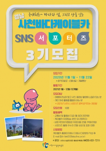사천바다케이블카 SNS 서포터즈 3기 모집관련 자세한 내용은 홈페이지 및 전화(055-831-7211)로 문의하면 된다.