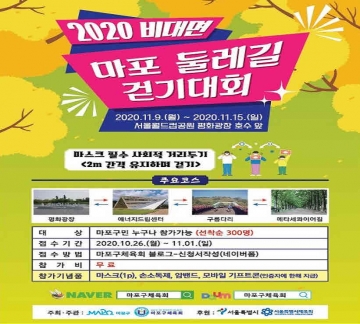 마포구(구청장 유동균)가 오는 11월 9일부터 15일까지 일주일간 구민 누구나 참여할 수 있는 비대면 방식의 ‘2020 마포 둘레길 걷기 대회’를 개최한다고 28일 밝혔다.