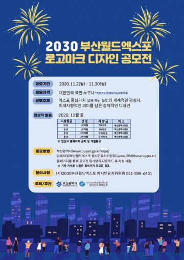 부산시(시장 권한대행 변성완)는 (사)2030부산월드엑스포 범시민유치위원회와 함께 전 국민을 대상으로 「2030부산월드엑스포 로고마크 디자인 공모전」을 개최한다고 밝혔다.