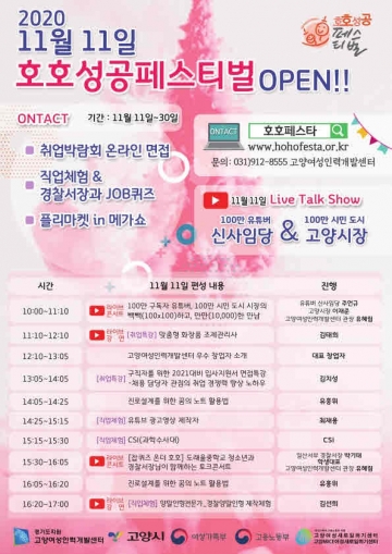 고양시(시장 이재준)는 11월 11일부터 11월 30일까지 고양여성인력개발센터에서 ‘2020 호호성공페스티벌’을 온라인 언택트 행사로 개최한다고 2일 밝혔다.