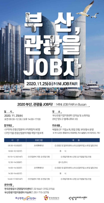 부산광역시와 부산관광공사는 한국관광공사, 관광일자리센터와 함께 관광분야 일자리 행사인‘MINI JOB FAIR in Busan’(이하 미니 잡페어)을 오는 25일(수) 부산관광기업지원센터에서 개최한다.