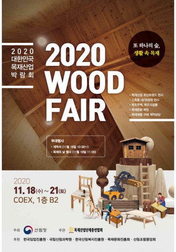 산림청(청장 박종호)은 오는 11월 18일부터 21일까지 서울 코엑스(비(B)홀)에서 ‘2020년 대한민국 목재산업박람회(WOOD FAIR)’를 개최한다.