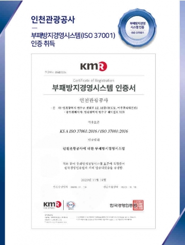 인천관광공사는 지난 9월 행정안전부 지방공기업 경영평가에서 최우수등급을 받았으며, 안전경영을 입증하는 안전보건경영시스템(ISO45001)에 이어 부패방지경영시스템 인증 취득이라는 쾌거를 달성했다.