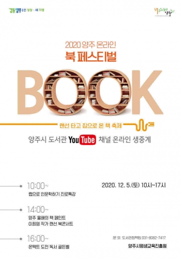 양주시(시장 이성호)는 오는 12월 5일 오전 10시 ‘랜선을 타고 집으로 온 책 축제’를 주제로 양주시 도서관 유튜브 공식 채널과 화상회의 플랫폼 ZOOM을 통해 ‘2020 온라인 북페스티벌’을 개최한다.
