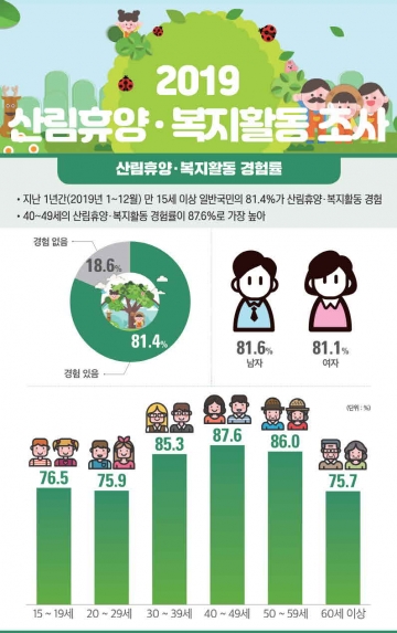 우리나라 만 15세 이상 국민의 81.4%는 산림휴양ㆍ복지활동을 경험하였으며, ‘휴양과 휴식’을 위해 산림(숲)을 방문하고, 자연휴양림 시설의 이용경험과 이용의향이 가장 높은 것으로 조사됐다.