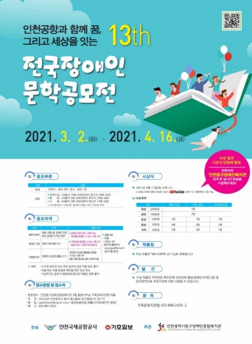 인천국제공항공사(사장 김경욱)는 제13회 ‘인천공항과 함께 꿈, 그리고 세상을 잇는 전국장애인 문학공모전’을 개최한다고 밝혔다.