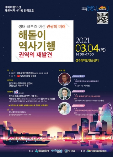 한편, 해돋이역사기행 관광포럼에 참여하기를 원하는 사람은 3월4일(목)까지 사전접수(http://naver.me/GJrGMHdE) 후 온라인으로 참여할 수 있다. 사전 신청자에 한하여 실시간으로 시청 가능한 유튜브 링크가 전송된다.