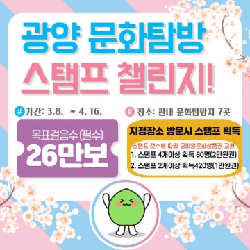 광양시가 걷기 좋은 계절 봄을 맞아 시민들의 비대면 걷기운동 유도 및 신체활동 증진을 위해 지역 내 문화탐방지 7곳을 선정해 모바일앱 워크온 스탬프 투어 챌린지를 운영한다.