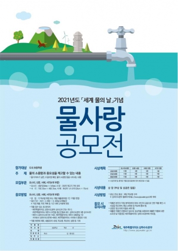 제주특별자치도 상하수도본부는 2021년도 세계 물의 날을 기념해 도내 초등학생 대상으로 ‘물 사랑 공모전’을 개최한다고 밝혔다.