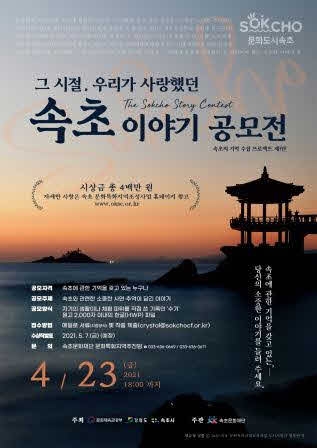 (재)속초문화재단(이사장 김철수)은 ‘2021 속초 문화특화지역조성사업’의 일환으로 속초와 관련한 소중한 사연·추억이 담긴 이야기를 수집하는 「그 시절, 우리가 사랑했던 속초」 이야기 공모전을 개최한다.