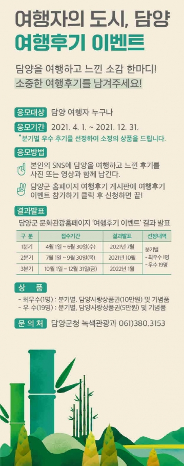선정된 후기는 담양 관광 홍보자료로 활용될 예정이며, 이벤트 관련 자세한 사항은 담양군 문화관광 홈페이지 또는 담양군 녹색관광과 (061-380-3153)를 통해 확인할 수 있다.