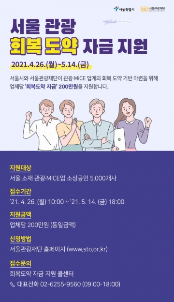 ‘서울 관광 회복도약 자금’은 서울 소재 관광, MICE 소상공인 5천개사에 총 1백억원(업체당 2백만원)을 지원함으로써, 정부 재난지원금에 더하여 두터운 지원을 실시하는 사업이다.