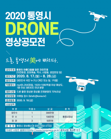 통영시(시장 강석주)는 최근 드론기술의 비약적인 발전과 사용자의 급증으로 누구나 쉽게 전문가 급의 영상을 촬영하고 공유할 수 있는 사회 문화를 반영해 ‘드론 영상 공모전’을 실시한다.