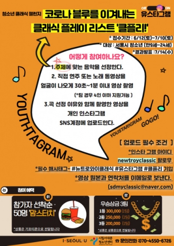 ‘클래식 챌린지 클플리’ 영상은 온라인플랫폼 ‘청소년클래식.co.kr’(6월 오픈 예정)에 업데이트될 예정이며, 인스타그램(@newtroyclassic) 해시태그 #뉴트로와이클래식, #유스타그램, #클플리를 검색을 통해서도 참가자들의 작품을 볼 수 있다.