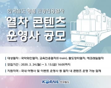 지원자격은 국내 여행사, 이벤트 대행사 등 열차 내 프로그램을 운영할 수 있는 사업자다. 기차여행 기획 및 공연 콘텐츠 운영 경험이 있으면 우대한다. 자세한 내용은 한국철도 홈페이지( www.letskorail.com )에서 확인할 수 있다.
