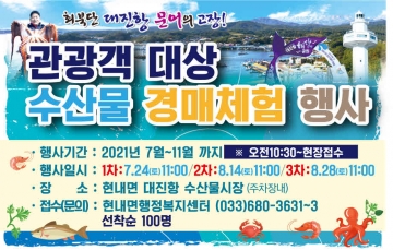 ‘관광객 대상 수산물 경매체험 행사’는 강원 고성군 최북단 대진항의 이미지 제고 및 관광객유입을 위한 관광 콘텐츠로 7월~11월 매월 둘째, 넷째 주 토요일에 선착순 100명으로 진행된다.