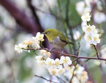 봄의 전령사 매화꽃의 꿀을 찾아 나섰을 동박새가 매화나무 가지에 앉아 있다.