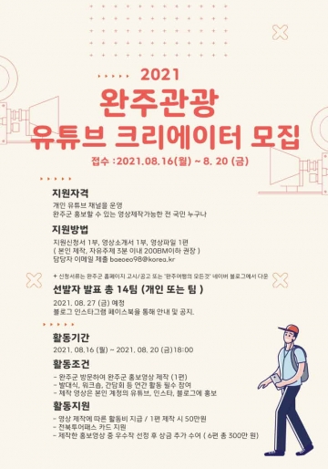 신국섭 행정복지국장은 “올해부터 내년 2022년까지 방문의 해를 추진하면서 다양한 미디어와 매체를 활용한 관광 콘텐츠 제작과 홍보에 집중하고 있다”며 “완주의 숨겨진 매력을 멋지게 영상으로 담아 낼 많은 유튜버들이 참여해주길 바란다”고 말했다.