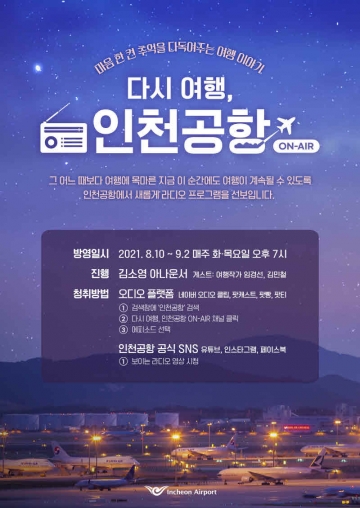 방송은 8월 10일(화)부터 9월 2일(목)까지 4주간 매주 화요일, 목요일 오후 7시에 네이버 오디오클립, 팟캐스트, 팟빵, 팟티를 통해 청취할 수 있으며, 인천공항 SNS 채널(유튜브, 인스타그램, 페이스북)에서는 '보이는 라디오' 영상으로도 시청할 수 있다.