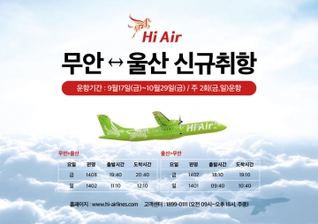 무안군(군수 김산)은 소형항공사 하이에어가 지난 6월 무안~김포 노선을 취항한데 이어 9월 17일부터는 무안~울산 부정기 노선을 금요일 19시 40분, 일요일 11시 10분, 주 2회 신규 취항한다고 밝혔다.
