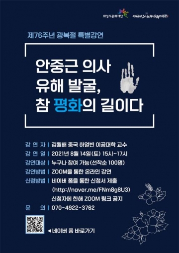 (재)화성시문화재단(대표이사 이종원) 제암리3.1운동순국기념관은 오는 제76주년 광복절을 맞이하여 8월 14일 오후 3시부터 오후 5시까지 ‘안중근의사 유해발굴, 참 평화의 길이다’라는 주제로 특별강연을 실시한다.