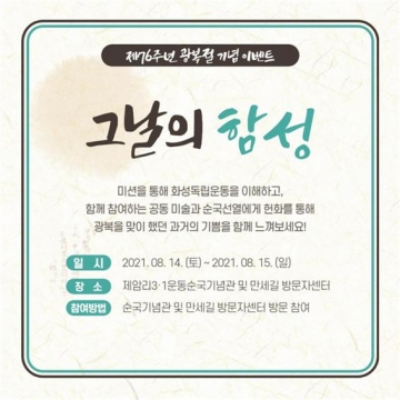 제암리3.1운동순국기념관은 화성 지역의 독립운동을 알리고 제암리·고주리 학살사건을 추모하는 기념관이다. 기념관 관계자는 “코로나19로 인해 움츠러드는 상황에서 시민들이 다양한 활동에 참여함으로서 광복의 기쁨과 독립운동의 의미를 더욱 가까이 느낄 수 있도록 노력하겠다”고 말했다.