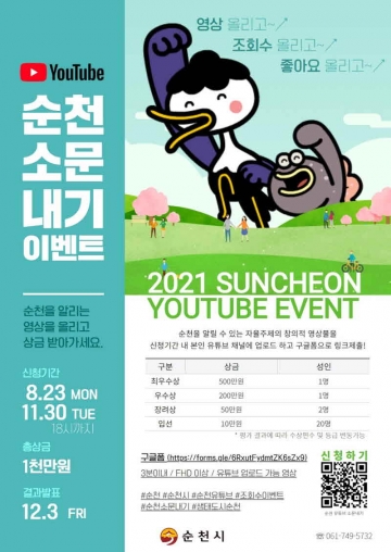 순천시 관계자는 “이번 유튜브 이벤트는 영상의 퀄리티를 평가하는 기존의 공모전에서 벗어나 조회수와 좋아요수를 위주로 평가하는 새로운 시도”라며 “많은 분들의 관심과 참여를 바란다.”고 말했다.