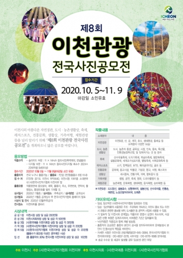 이천시(시장 엄태준)는 이천의 다양한 축제·관광자원의 홍보 및 관광객 유치를 위해 「제8회 이천관광 전국사진공모전」을 개최한다.