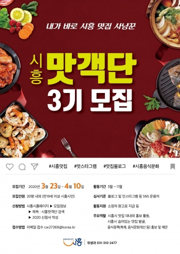 모집기간은 3월 23일부터 4월 10일까지이며, 시흥시 홈페이지(www.siheung.go.kr/main/) 시정소식의 모집정보란에 ‘시흥맛객단’으로 검색하면 자세한 내용 확인과 참여 신청이 가능하다.