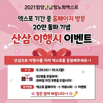 20만 돌파 기념 이벤트는 내달 4일까지 ‘산삼’으로 엑스포 응원 이행시를 지어주는 사람들에게 치킨 쿠폰을 선물할 계획이다.