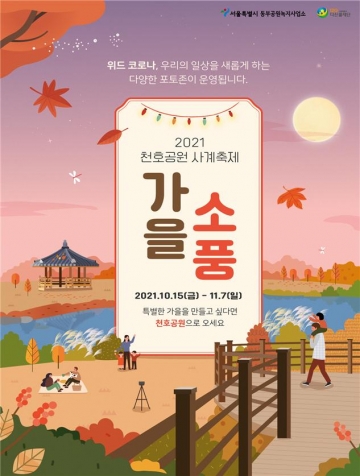온라인 SNS 이벤트는 <천호공원 사행시 짓기>와 <천호공원 숨은그림찾기>가 10월15일부터 11월7일까지 ‘서울의 공원’ 공식 인스타그램을 통해 진행되며 시민 누구나 참여할 수 있다.