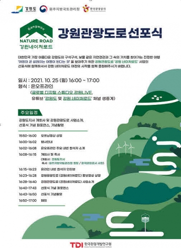 강원 관광도로는 그동안 고속도로를 통해 동해안으로만 집중되어 온 관광객들이 국도와 지방도를 달리며 강원도의 숨겨진 비경을 만나고 청정 지역에서 안전한 여행을 할 수 있도록 고안되었으며, 지난 6월부터 강원 관광도로의 브랜딩·홍보·상품판매·경관개선 사업 등의 실행사업 용역을 (사)한국관광개발연구원에서 수행하고 있다.