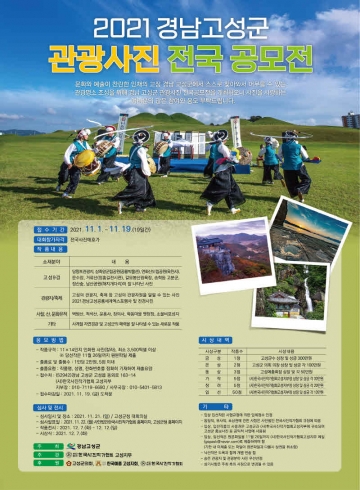 고성군(군수 백두현)은 오는 11월 1일부터 19일까지 전국민을 대상으로 고성의 아름다운 관광자원을 담아낸「2021 경남 고성군 관광사진 전국 공모전」 의 응모작품을 접수한다고 밝혔다.