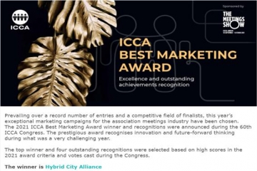 국제컨벤션협회는 코로나19 팬대믹 상황을 반영해 올해의 시상 기준을 ‘위기를 기회로 바꾼 도전의식이 빛나는 선도적 마케팅 기관(Marketing through Transformation)’으로 정하고, 혁신적인 마케팅을 선보인 5개 기관에게 'ICCA BEST Mareketing Award'를 시상했으며, 서울은 'Hybrid City Alliance'와 함께 6대륙 22개 도시의 공동 마케팅, 특별한 협업 및 파트너십(Extraordinary collaborations & partnerships)으로 1위로 선정되어 최우수상을 수여받는 영광을 얻었다.