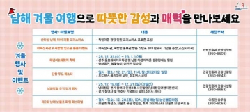 남해군이 겨울 여행 수요를 끌어들이고 체류형 관광을 활성화하기 위해 연말까지 지역 곳곳에서 다양한 행사와 이벤트를 선보인다. 남해 특유의 따뜻한 감성과 지역 자원을 활용한 프로그램을 통해 겨울철 관광 비수기를 극복하고 방문객 만족도를 높인다는 전략이다.