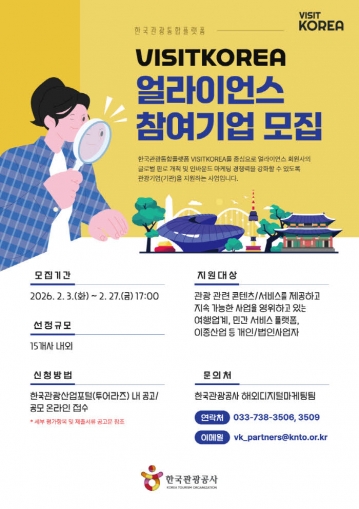 VISITKOREA는 8개 국어로 운영되는 글로벌 관광 플랫폼으로 연간 방문자 수 3천300만 명, SNS 팔로워 370만 명을 보유하고 있다. 올해로 3년 차를 맞은 VK 얼라이언스는 VISITKOREA의 웹 앱 SNS 등 다채널을 활용해 회원사의 콘텐츠 상품 서비스를 외래 관광객에게 효과적으로 알리는 협업 마케팅 사업이다.
