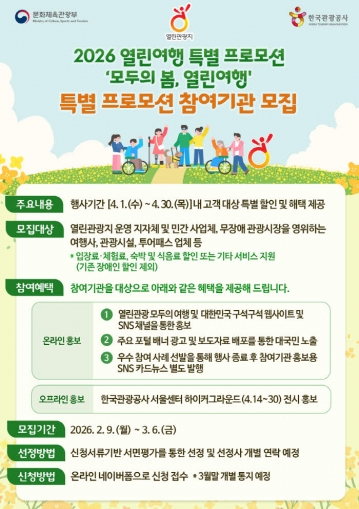 한국관광공사는 2월 9일부터 3월 6일까지 2026 열린여행 특별 프로모션인 모두의 봄, 열린여행에 함께할 지자체와 관광기업을 모집한다고 밝혔다. 이번 프로모션은 오는 4월 20일 장애인의 날을 맞아 무장애 관광을 활성화하고 관광취약계층의 여행 접근성을 높이기 위해 4월 한 달간 진행될 예정이다.