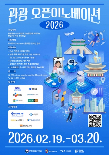 문화체육관광부와 한국관광공사가 3월 20일까지 2026 관광 오픈이노베이션 사업 공모를 통해 대중견기업과 협업할 관광 스타트업을 모집한다. 혁신 기술을 보유한 스타트업과 관광 분야 확장 수요가 있는 수요기업을 연결해 산업 전반의 혁신을 촉진하고 유망 기업의 성장을 지원하기 위한 취지다.