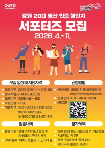 모집 인원은 총 50명으로 2021년부터 2025년 사이 강원 20대 명산을 1회 이상 인증한 경험이 있는 참여자를 대상으로 한다. 선발된 서포터스는 오는 4월부터 11월까지 약 8개월간 활동하며 강원 주요 명산을 직접 등반하고 체험 콘텐츠를 제작하게 된다.