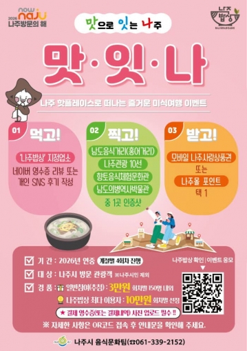 한편 이벤트는 오는 5월 31일까지 진행되며, 자세한 내용은 나주시 홈페이지와 공식 SNS 채널, 나주밥상 지정업소 및 주요 관광지에 비치된 홍보물을 통해 확인할 수 있다.